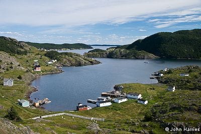 Aluminum expedition sailboat Morgan’s Cloud anchored in Exploits, Notre Dame Bay, Newfoundland.