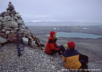 Two crew from aluminum sailboat Morgan’s Cloud having fun at the cairn overlooking Kinnvika on Nordaustlandet, Svalbard.