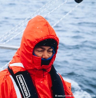However, on the Jongert the crew kept the temperature in the wheelhouse at shirt sleeve level, despite the near freezing wind chill outside. In this case a Mustang suit at the wheelhouse door provided a quick way to get properly dressed in the case of a problem on deck. I can’t say I really liked this hot house approach since there is always the temptation to ‘just nip out for a moment’ improperly dressed, but I was overruled in the thermostat wars.