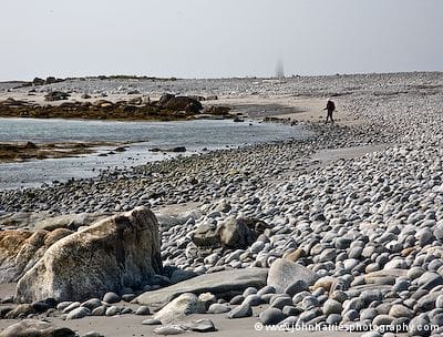 Phyllis hikes along the rocky shore of Cape Sable Island with the lighthouse in the background partially obscured by fog.