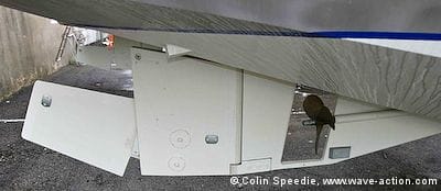 The OVNI 435 aluminum sailboat has a well-protected rudder and prop.
