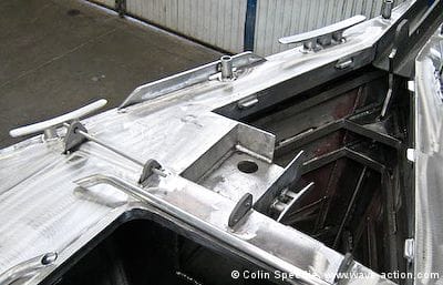 The answer is to scale up accordingly, both above and below deck. For our new boat, we have specified oversized welded cleats, and added a huge additional pair in the bow, where from previous experience we know we’ll need them. We have no fairleads, simply wide and open access to the cleats, allowing all angle attachment. Extra cleats also allow one warp for one job, essential when additional warps such as shore lines are required.