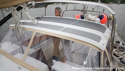The hard dodger on aluminum sailboat Morgan’s Cloud was designed with a rim to hold onto while standing in the cockpit and is at the perfect height for forward visibility. The bimini is high enough to stand beneath with plenty of room for good visibility between the dodger and bimini.