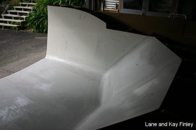 An interior view of the fiberglass hard dodger for Lane and Kay Finley’s Annapolis 44 sailboat, Mai Tai, prior to cutting out the windows.