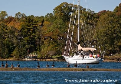 Aluminum sailboat Morgan’s Cloud and Canada geese enjoy a break from winter in Mill Creek, Chesapeake Bay.