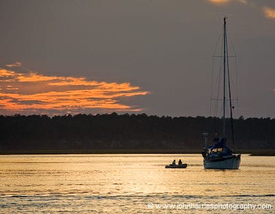 A couple return to their anchored sailboat at sunset in the St. Marys River, Georgia.