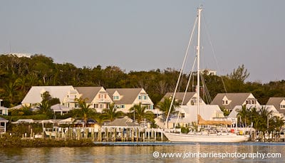 Aluminum sailboat Morgan’s Cloud at anchor in White Sound, Green Turtle Cay, Bahamas.