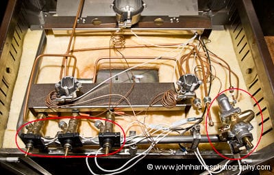 Topics > Food/Cooking > Force10 Stove (Cooker), Problems, Take Two > The Force10 stovetop showing the disassembled defective valve on the right and the three defective spark igniter control switches on the left, on aluminum expedition sailboat Morgan’s Cloud.
