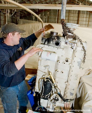 The Cummins engine as it is lifted out of the companionway on Morgan’s Cloud.