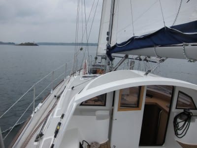 After a good night’s sleep aboard I was rested and looking forward to a short sail aboard the Boréal 44. But as Jean-Francois Eeman arrived with breakfast, things didn’t look promising as we looked out through the drizzle onto a flat calm river. Eventually though we agreed to go out and look for some wind out in the bay.And it was as well that we did, as we were rewarded with a light breeze outside that at least enabled us to put her through her paces a little.