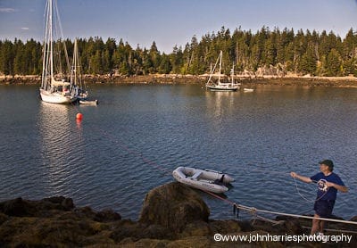 Pulling in the dinghy that is tied to the shore fast off the stern of “Morgan’s Cloud” to keep her from swinging into the sailboat moored close by at The Mud Hole, Great Wass Island, Maine.