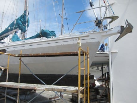 Three years on, and most of the patches we repaired are OK, but some have done badly, mostly where they’re in areas that get abrasion or chipping. And then there are a whole new crop of blisters. At the moment I’m sanding and just leaving those areas until we’re at rest and able to finish them properly and start the painting process in perfect weather in one go.