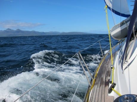 Well, when we left the mooring, we had the bottom end of F6 on the beam, for a quick scoot to a sheltered loch for the night. And it was quick, the boat going well, and not too much weather helm, but that was no surprise as we had three reefs in the main, and only half the genoa out. Another few knots and we’d have been deciding whether to drop the main or roll up the genoa. There was no question that we were running out of options in not an awful lot of wind, and I’ve no doubt that the high freeboard played a major part, allied to a shoal draft keel and shallow underbody.