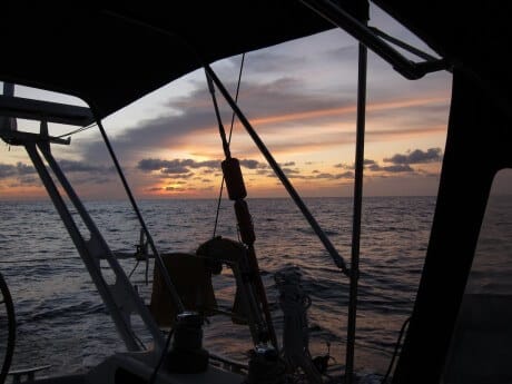 An inky, starlit night became a bright sunny day, with puffs of cumulus above an indigo sea, broken only by the shocking white of the odd breaking crest. The wind eased a little through the day, allowing the sea to settle down, and life for the watchkeeper was easy with nothing in sight to disturb the peace. For the many of you who have experience of this type of sailing, I’m sure you’ll agree that this is as good as it gets, and for those of you who aspire to the same—you’re going to love it!