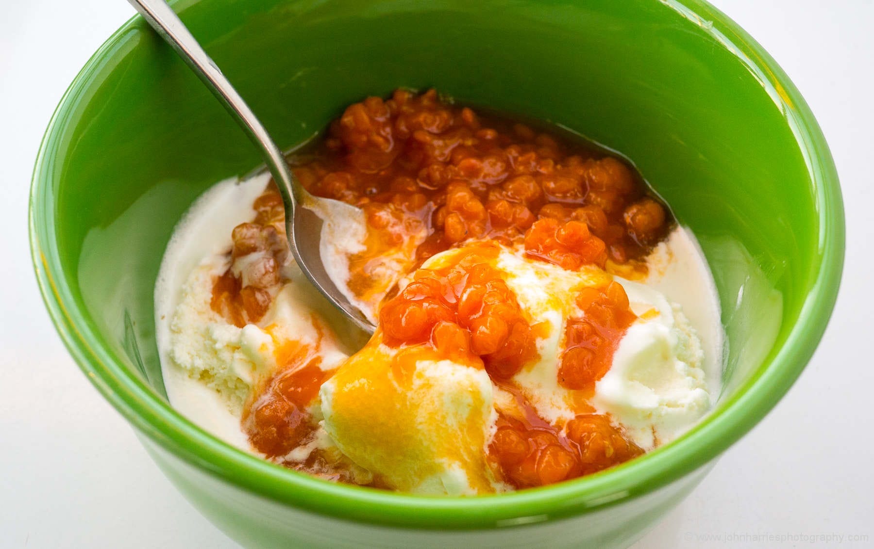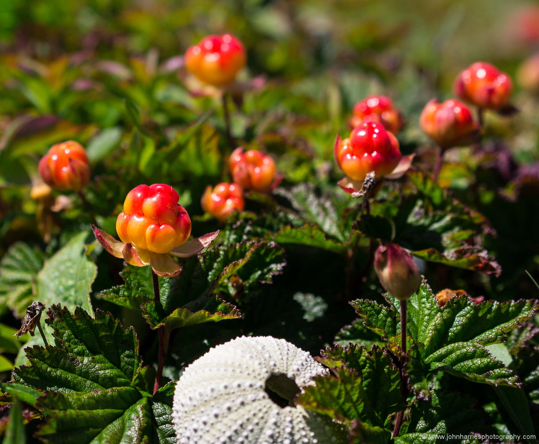 These are cloudberries in the wild, which are called moltebaer in Norway, where it’s better that you rob a bank than pick someone else’s, and Bakeapples in Newfoundland. Whatever you call them, they are delicious. These are not ripe yet, but it looks like a good year for them. We bought some of last year’s that had been canned.