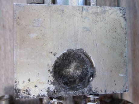 The item is the underside of the ram block. The hole is where an ertalyte bush is located, which in turn house the ball on the base block. As you will know the ram is mounted under a bridge in the cockpit floor, and so is often soaked from rain or waves, and (in this case) being of dissimilar metals (the base is stainless) pitting has occurred.