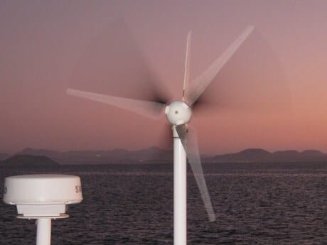 We have a three bladed earlier version of the Air turbine on China Moon, and it certainly can shriek when the wind gets up! I believe that while the peak power output of some generators may be high, that if they don’t start until the wind gets to say 10 knots they are unlikely to produce as much power over the months as a nominally less powerful generator which spends more time generating, at lower wind speeds.