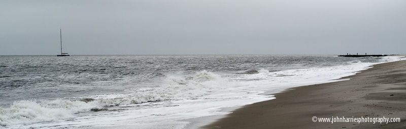 We were walking along the beach at Cape May, New Jersey on a blustery day with an onshore wind. The boat appeared around the headland coming from Delaware Bay steaming with no sail up and right on the shallow water contour.