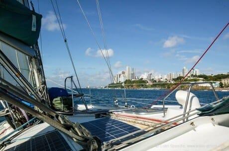 But what a pleasure that made the last couple of days. The sea settled down at last, we were able to sail the boat upright, and we slid comfortably down the Brazilian coast enjoying quiet nights with only the wheel of stars and the occasional visit from brown noddies that took up residence on the guardwires. We sighted land on the morning of the 4th of January, and finally hardened up and sailed into Salvador early that evening. To say that it was something of a culture shock to enter such a huge bustling city after fifteen days out of sight of land is something of an understatement—but didn’t it feel good.