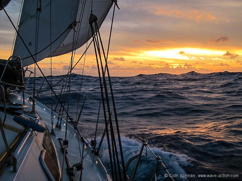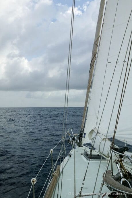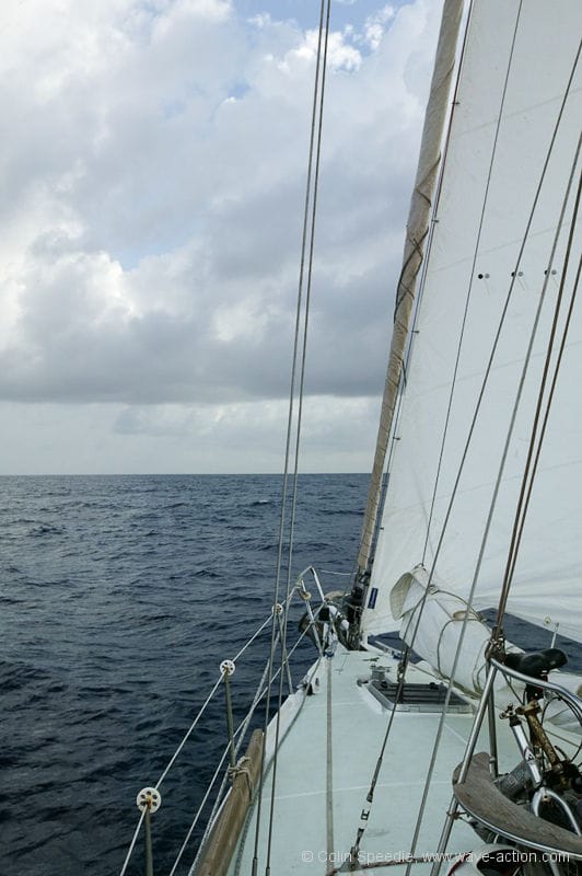 But you can’t miss them all, and over the next few days we received our fair share of soakings. The wind that accompanied the squalls was welcome though, and we took as much advantage of it as possible, although far too often as fast as we reefed the wind died away, leaving us rolling around under-canvassed in a sloppy sea.