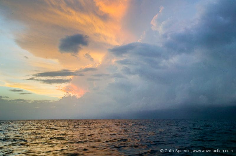 Mostly there was little thunder and lightning, although one huge squall that bore down on us suddenly exploded into spectacular life at less than a few miles distance, sending us scurrying away as fast as we could before it could engulf us. Bad weather I don’t mind, as you generally have time to prepare yourself for it, snug the boat down and get some food on the go, but lightning I hate.