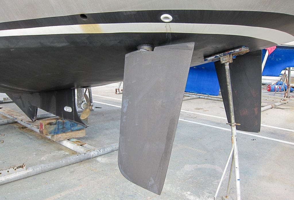 Massive stock and all welded one-piece construction on the Boreal 44. An end plate is used to improve hydro-dynamic efficiency and reduce tip losses, and also to protect the shell when drying out, as the boat is designed to do.