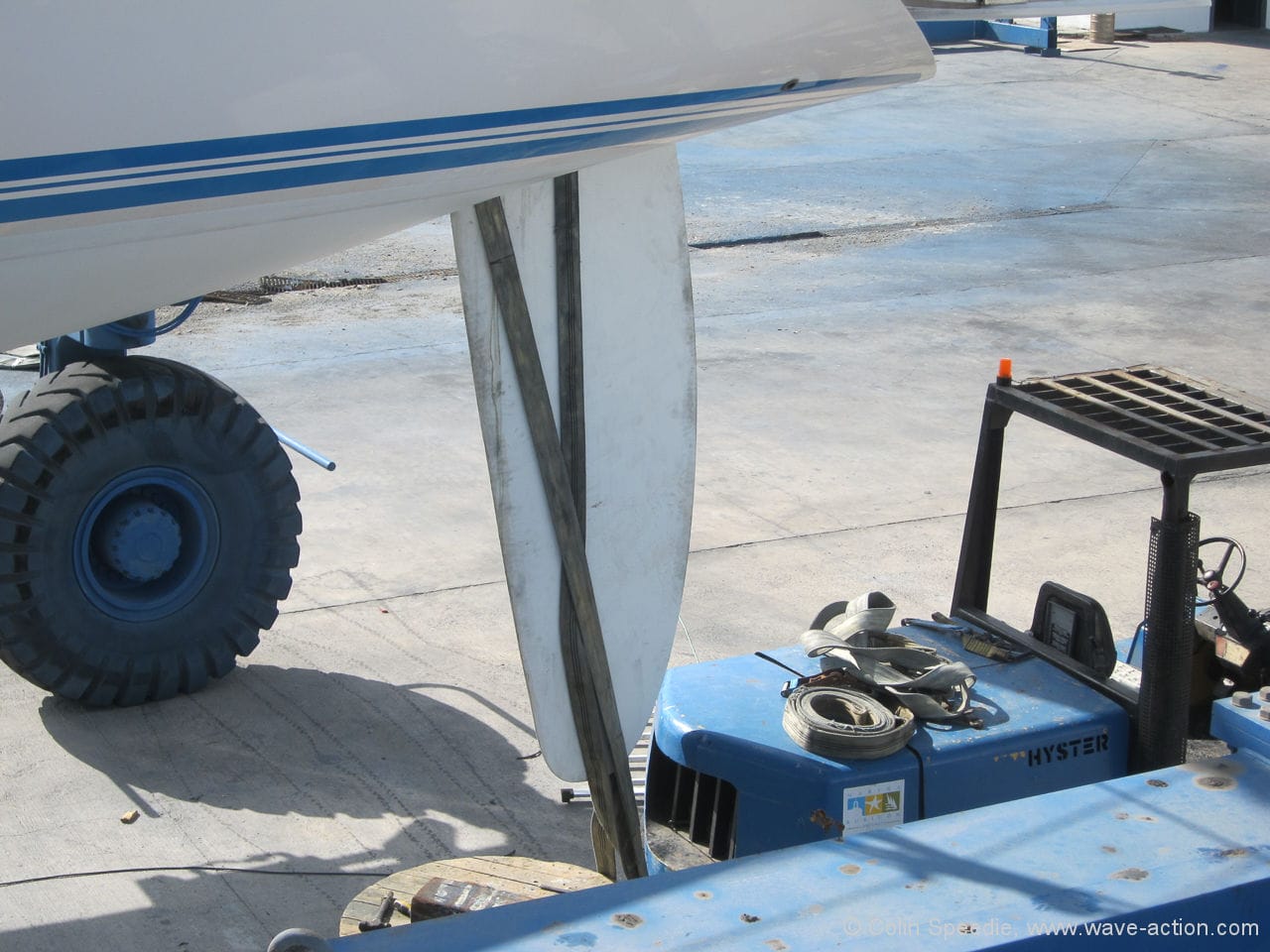 These strops were attached to the forklift while the boat was lifted by the travel hoist, but they still failed to budge the rudder. The moral of this story? Remove and service regularly.