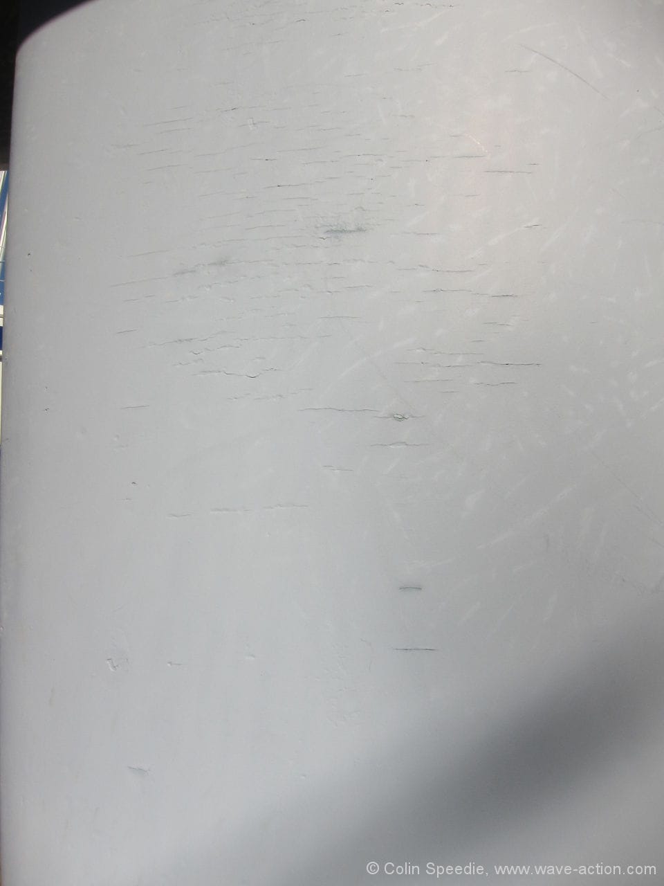 And in this case something was obviously suffering, as there were deep cracks visible on both sides. GRP stock, too, with visible repairs on the rudder shell, effected with epoxy filler, before setting off—for the Atlantic…