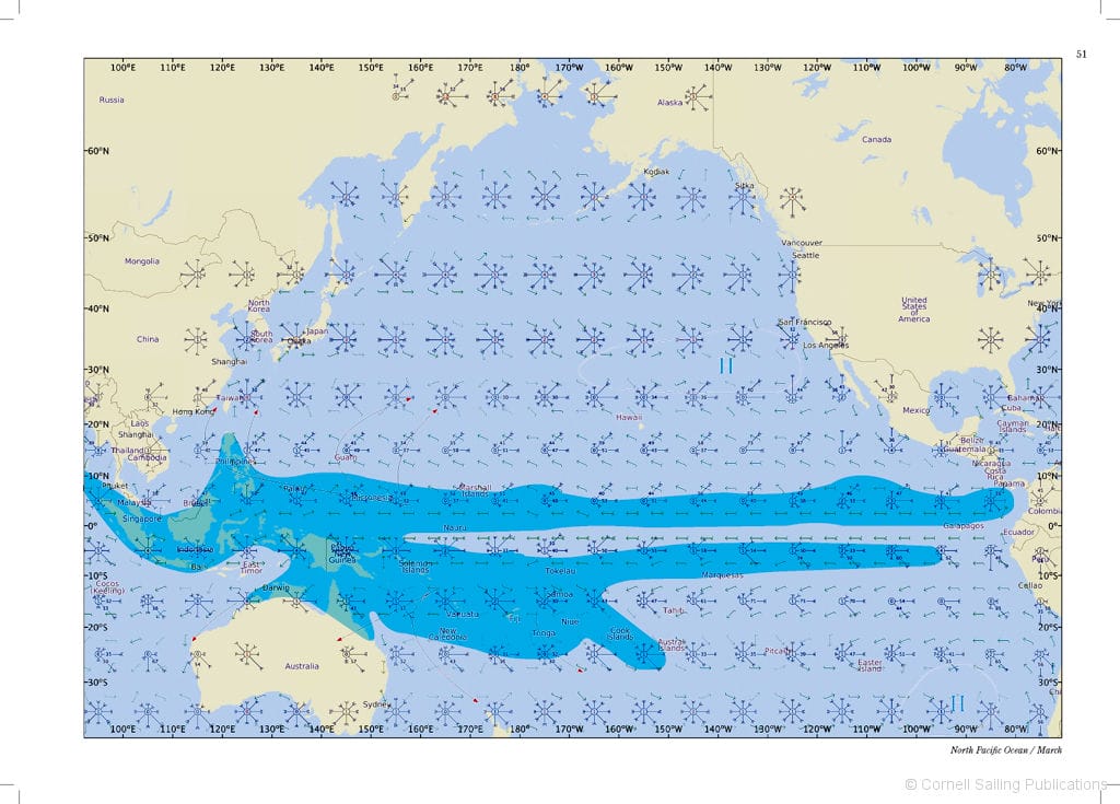 Incidentally – the page selected from the Ocean Atlas for the article shows a major change in wind direction and speed for the traditional Pacific crossing from the ‘old’ pilot charts – which is why it was selected for this piece.