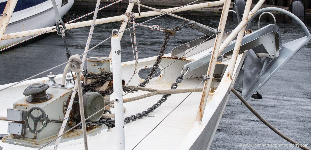 The bit of a surprise here, is that the port anchor looks to be fine with two properly sized shackles. Can’t see the mousing, but it makes me think this picture caught the owner at a time of transition for his starboard anchor.