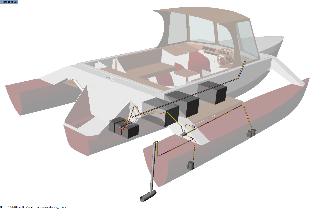 The total: 12.7 m of heavy cable (~4 AWG), 38 m of light cable (~10 AWG), and 7.8 m of control cable. And that’s with a wood-composite hull where we can easily share much of the negative wiring; a metal hull would call for a bit more cable because of the need to use double-pole breakers.
