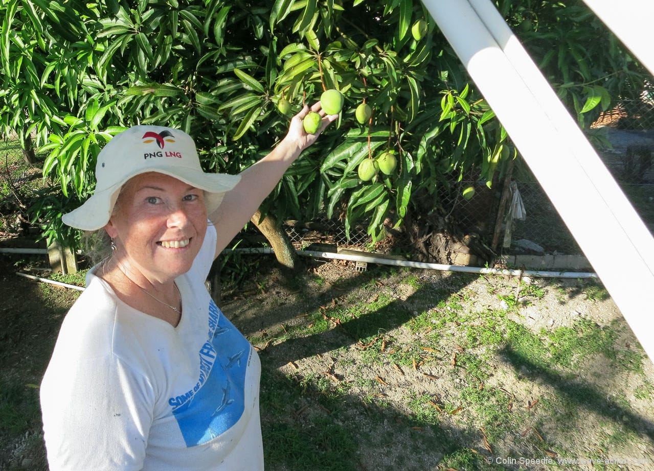 The weather’s good, so working is easy, and although it’s baking hot, that just can’t be helped so we simply accept it. There are mangoes to be picked from our transom, wonderful bird life, iridescent iguanas and cute geckos. Plenty of bugs, though, including some the size of small birds—well, it can’t all be perfect now, can it? Every time I hear a yelp from Lou I know that one has just whirred by.
