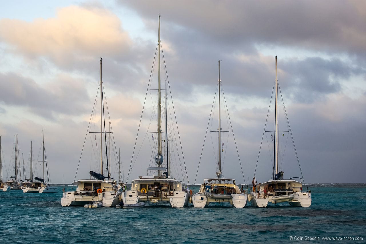 Come evening and the place really began to fill up, and to our dismay we watched as a group of charter cats took up residence right upwind of us, and began to raft up. And in no time at all, our uninterrupted view of the reef had disappeared behind four, then five cats, all lying alongside one another. As by this time there wasn’t a lot of option to move, we settled down to watch the windspeed, and hope that the combined anchors of the cheery pontoon party ahead of us held. Bedlam, and by nightfall, the anchorage was absolutely jammed.