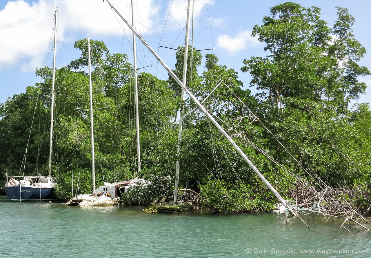 I don’t think anyone would deny you that “fit for purpose” charter, but in sailing we have to deal with what’s thrown at us, and it’s not always sunshine and trade winds. I was in Antigua last Monday for the conversion of Gonzalo from a TS to a hurricane and saw some pretty horrible things happen to boats new and old. I was impressed with a very ordinary ’80s Jeanneau 32 that pulled its dock apart at the stern and then snapped its bowlines. Despite some ferocious grinding on both another boat and a concrete post, the damage was largely cosmetic. Some more modern, higher freeboard boats were sunk in Jolly Harbour and made a sad spectacle for the rest of the week we were there. It made me consider the limits of seamanship (a spiderweb of adequate lines to a dock that itself breaks free just means you’ve run out of options) in the face of rough stuff. I suspect the bad damage I saw to a Hunter 42 was in part due to the windage inherent in the design. This is why I find many modern designs on the “fair-weather” side: great for charter, but charters don’t generally go out in the snotty stuff.