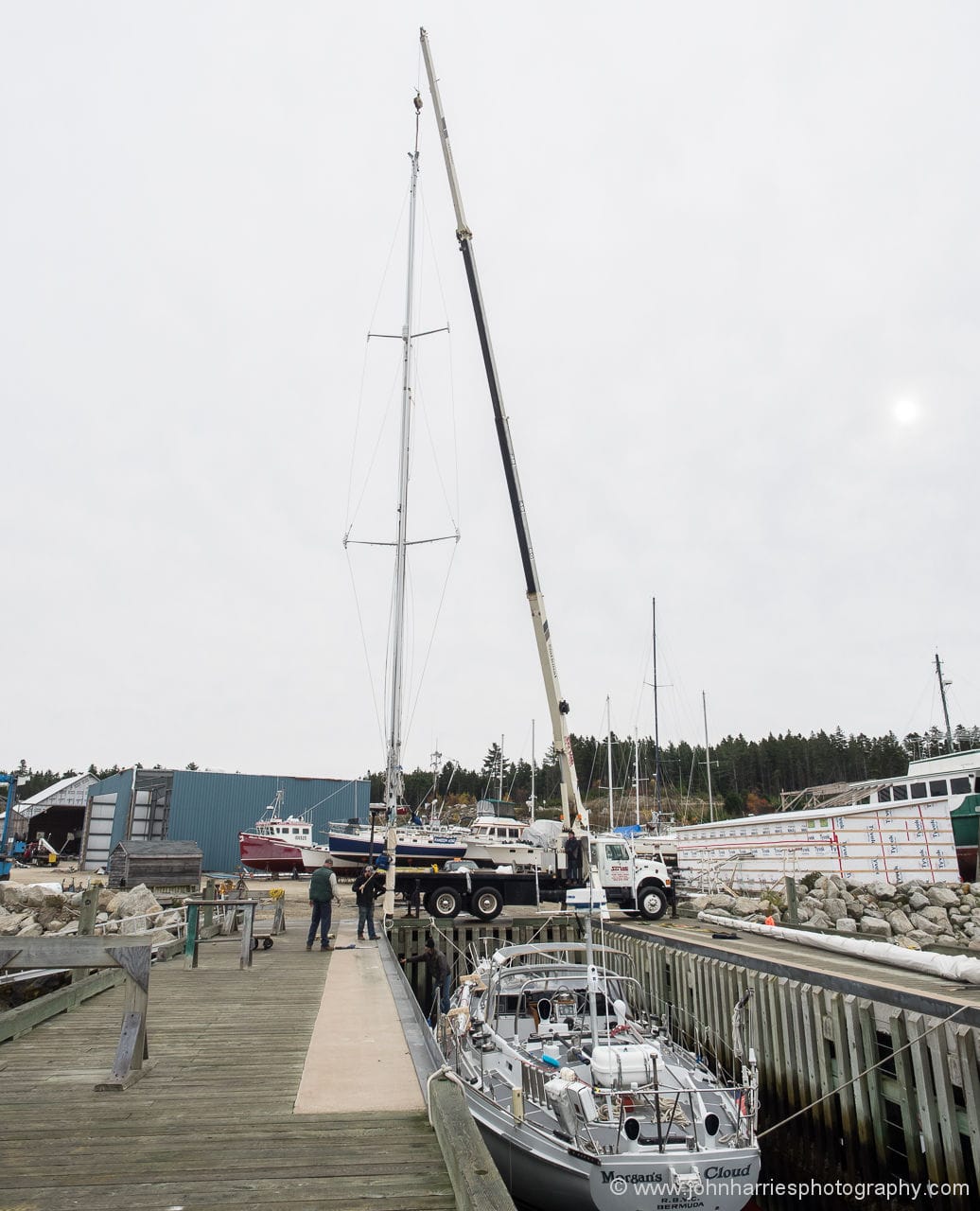 If, as I have, you find yourself in charge of the lift either because it is a do-it-yourself boatyard crane or the crane operator that you have hired is inexperienced around boats, plan the whole operation in detail. Have a pre-lift conference to review every step; if the operator does not have a clear view of you standing on deck (quite probable) assign a spotter who will always stand in clear view of the operator to relay your signals; forbid anyone else from directing the operator; don’t rely on shouted instructions; work out and understand hand signals between you and your spotter and the spotter and crane operator for “up slow”, “stop” (hold), “down slow”, etc; post someone (not you) below deck with a hatch open so you can be in voice contact at all times; lift from above the balance point (seems obvious but I have seen masts slung below the lower spreaders with near disastrous consequences); transfer the vertical load from the sling to something strong near the base of the mast (I use the halyard winches); go slow and do not rely on brute force (your crew should not ever have to do any heavy lifting).