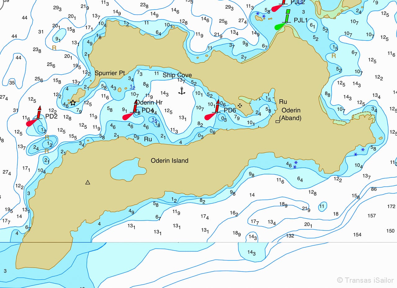 Today, Oderin is a much quieter place—only one house, with fish store and wharf, is still being used occasionally and the rest are collapsed or on their way out. The chart shows three navigation buoys in the approaches, but only one, a red on a rock entering the inner harbour, is still in place. (Another is on the beach in the anchorage, still flashing red x 3 seconds into the sand.)