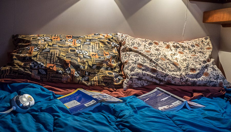 Another perk is a silk duvet! We bought these at Costco and now have them on all of our beds both at home and on the boat. They are quite thin but offer excellent comfort both winter and summer. Since they are silk, they are mildew resistant and non-allergenic. Way warmer than a man-made fabric and not as difficult to manage as a down quilt. It’s amazing how comfortable they are year-round.
