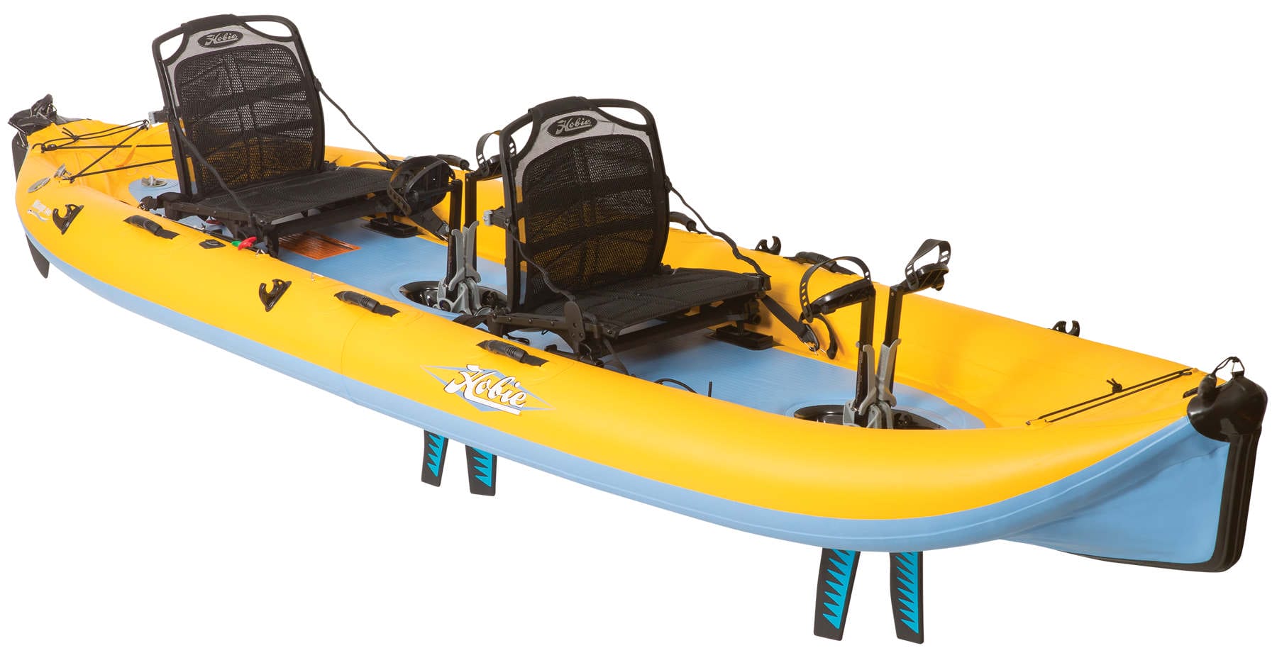 The above photo shows the Hobie Mirage Tandem Island, capable of the wind-driven performance that has traditionally been the hallmark of the Hobie brand, is the largest boat in a lineup that now includes numerous sizes and variants. A number of those boats are single-hulled plastic kayaks. Others, designed with cruising sailors in mind, have inflatable hulls that fold down to duffel-bag size.