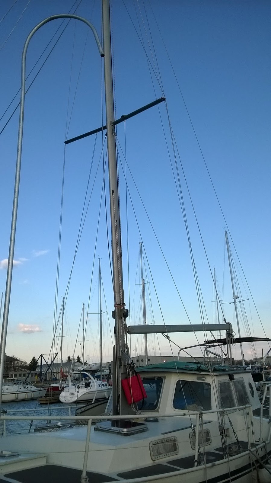 No real worries, John…it’s just how the boat was rigged! We could use the main halyard as described, I suppose, and use the topping lift as a hoist for an SS wire antenna. The angle’s too tight between the mast base and the leading edge of the pilot house for a solid vang, I suspect. We’re still experimenting.