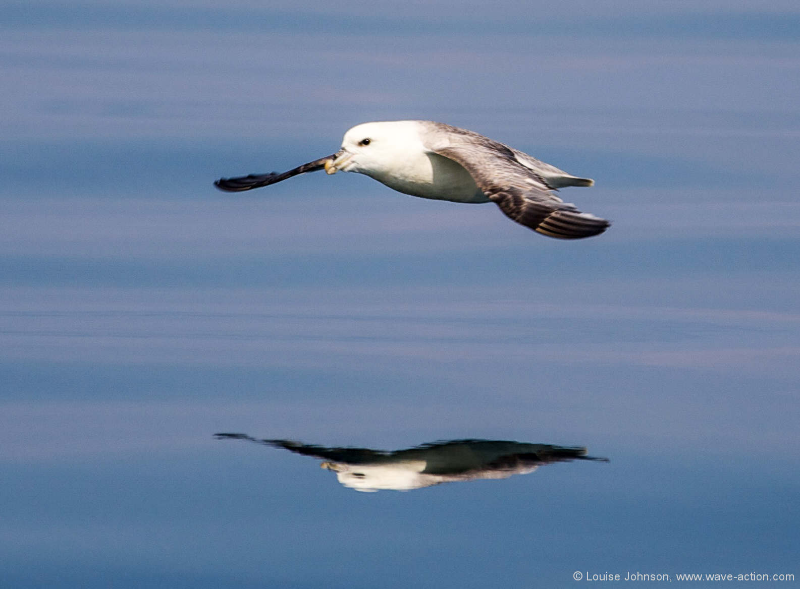 Fog is often accompanied by wind in these latitudes, and we were enjoying a fresh breeze as we sped along the coast, keeping well away from any dangers close inshore. As far as we could see the only living things out on the water were a few shearwaters and fulmars; ghostly presences that occasionally swooped into our cocoon-like aura.