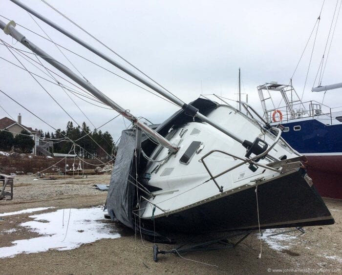 I have warned before about the dangers of winter storage on jackstands with the mast in, particularly in areas like Nova Scotia where the ground heaves due to freeze and thaw cycles. Anyway, the picture above is another sobering reminder.