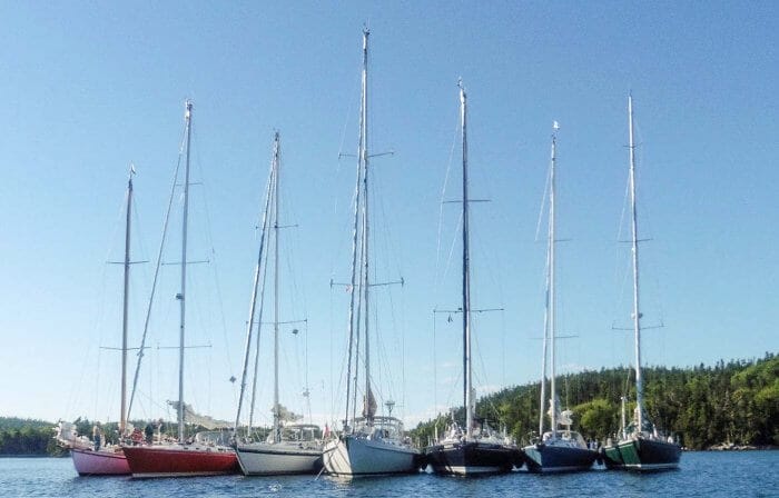 Love that raft-up picture. I’ve rafted with my friend Dan, me in my Cape Dory 25 on one side, Hanley in his H-28 on the other, Dan in the middle with his 80 feet of chain and Manson anchor. Dan’s the only person I would do that with, and it is because he has spent years of quiet study and observation of anchoring, which has earned him a reputation and a nickname “80 foot Dan.” He’s also known as “Spam and Yams Dan”, that’s another story.