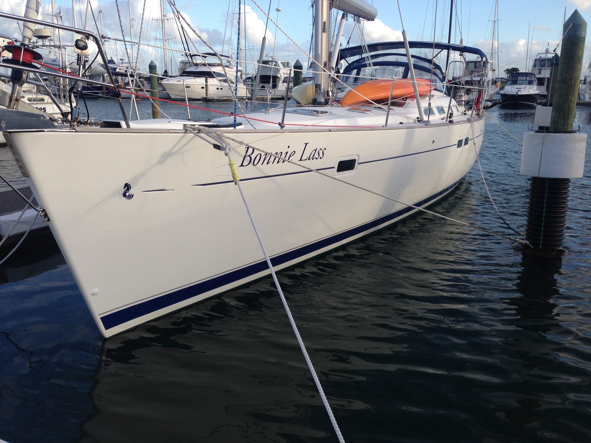 The solution we have is marina mooring rings, with a cylindrical fender (in white) on-top of the mooring ring, supported by a piece of drain coil. Then we have the stern line (we moor bow in) pre-attached to the pile mooring ring ready to catch. A 2.5mm line runs from the spliced eye of the mooring line, to a “dinghy” block attached to the top of the outer pile, and then to the same set-up on the next pole, and then into the water with a heavy weight attached. Let go the line and it comes out of the water magically at hand for the return. We have a similar setup on the finger side with stern line and magic spring suspended ready. I only have to get one line on to be moored in our “box” – we can’t go anywhere!