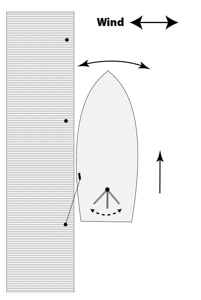 I doubt that your midships cleat is on the balance point—the test above will tell you for sure—but it may easily be close enough to make a single spring docking practical, and that’s all that really matters. That said, as we will see in future chapters, the closer a spring is to the balance point the more options it gives us in tricky situations. Also, having used both, we have found an aft running spring is generally more use in tricky situations than a forward running one, but that’s not a huge issue and both will work.