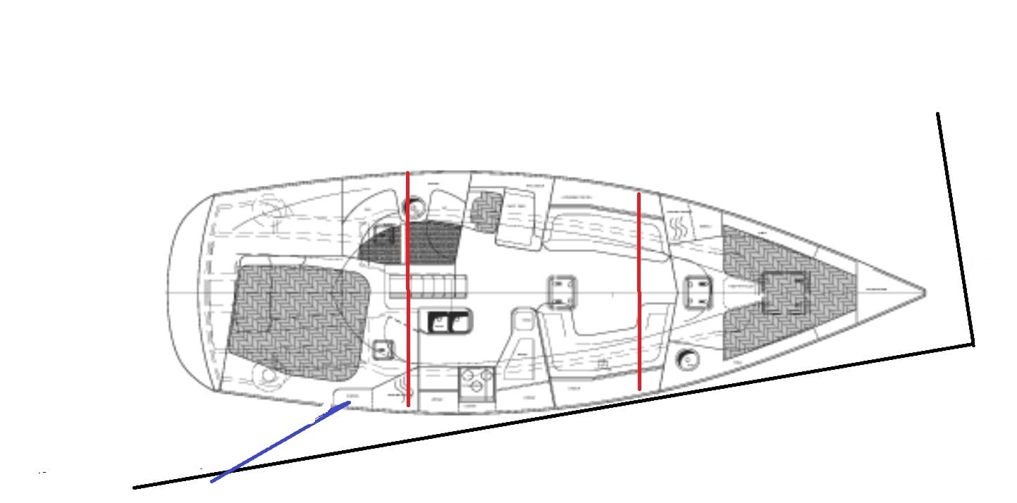 After a couple days of docking and testing variations, here’s where I ended up. Because of the starboard prop walk, my preferred tie, and what I picked for our home slip, is bow in starboard. Two-thirds back is a little too far forward for starboard tie because the prop is offset to port and it creates a bit of a rotational force, so I had to move the line further back to keep better control of the bow (port tie, while not preferred because of the direction of prop walk, the balance point is almost at 2/3 back). The resulting line for starboard tie is about 5-6 feet long when the transom is aligned with the back of the slip, so a little shorter than this recommends, but I’m able to be pretty light on it as we come in and I’m using 3 strand line so it’s pretty stretchy. It’s balanced enough to pivot either direction in idle once it’s “settled”.