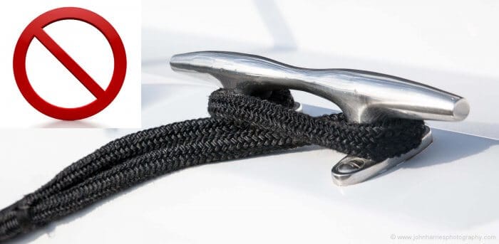 As for cleat loops (like John’s “do not do this” photo): This technique works quite well for little boats, under one tonne or so, where you never adjust or release the line from the boat side. It’s definitely not appropriate for larger vessels.