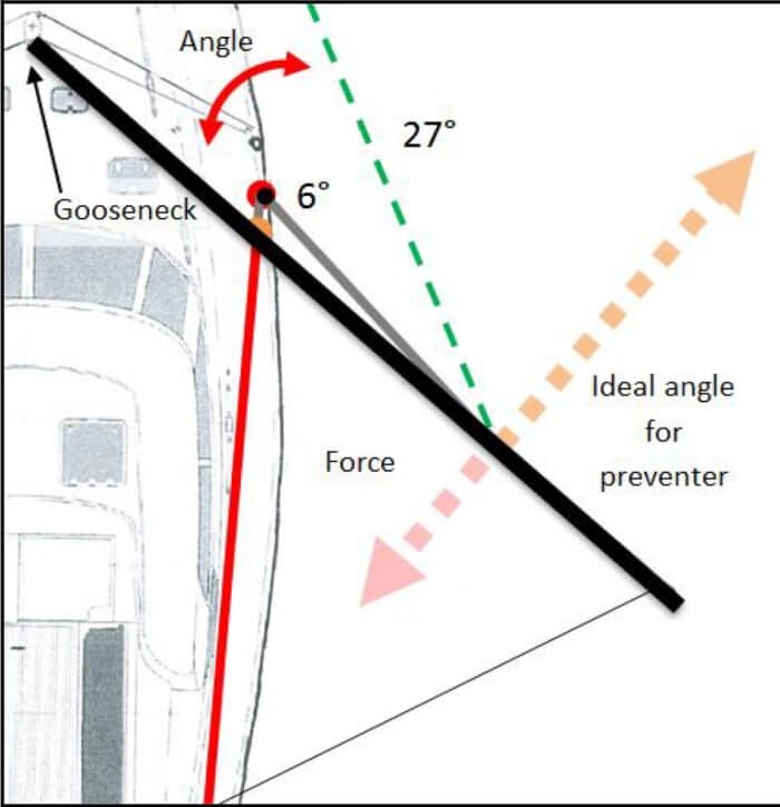Hi John, wouldn’t this “bit of trig” depend on whether a substantial, properly rigged and adjusted vang (kicker) was employed? Having said that, cruising yachts with amidships preventers may well also have old handy billy type tackle, usually hanging slack because the owner doesn’t like the creaking noise…. But if you have no vang, there will definitely be a substantial vertical force as you say. But if the boom crashes down into the sea, with the dynamic forces of the boat rolling with an apposing wave providing upward force in a “perfect storm” scenario, the resultant vector (force) on the preventer could be way more than double I would have thought?