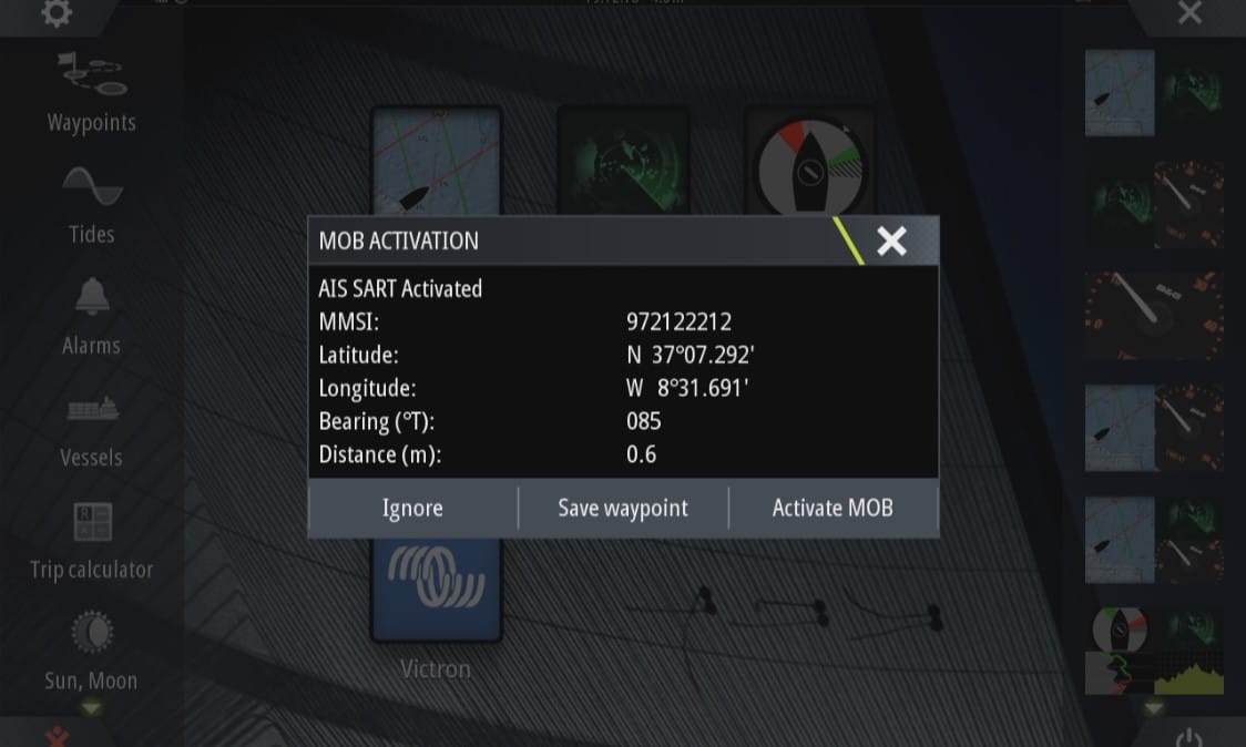 2. My B&G Zeus 3, software april 21, pops up a window acknowledging the AIS-SART with the position giving the options of ignore, store a waypoint or activate MOB on the Zeus.