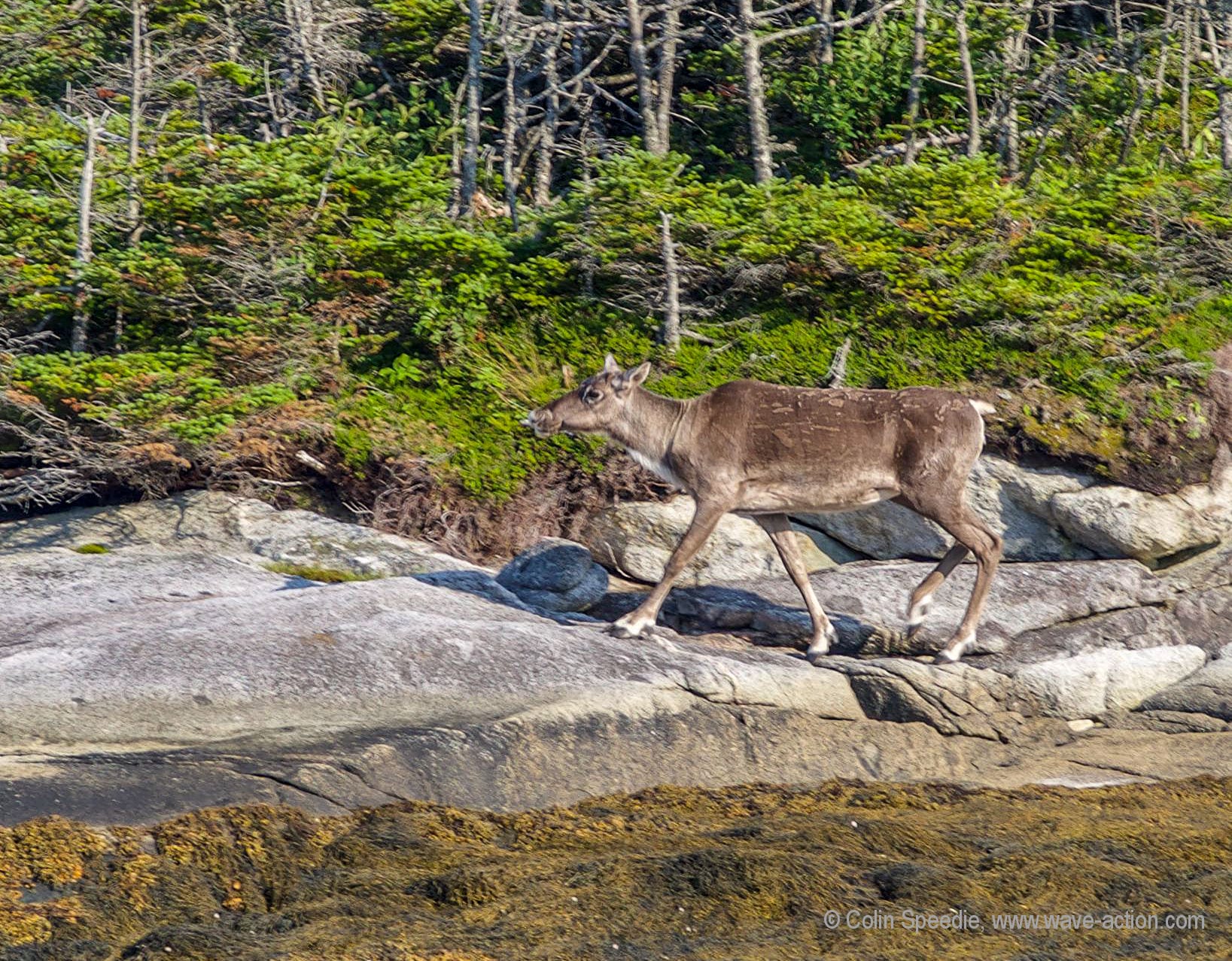 As we rounded up and quietly motored up to the head of the cove, an otter swam alongside, taking no notice of the tin interloper entering its realm. We anchored up at the head of the cove off a small white sand beach and as the engine was shut down we were immersed in total peace. Sitting in the cockpit later we watched a caribou pick her way unhurriedly down the rocks no more than 50 m away, stopping to nibble at patches of vegetation as she went.