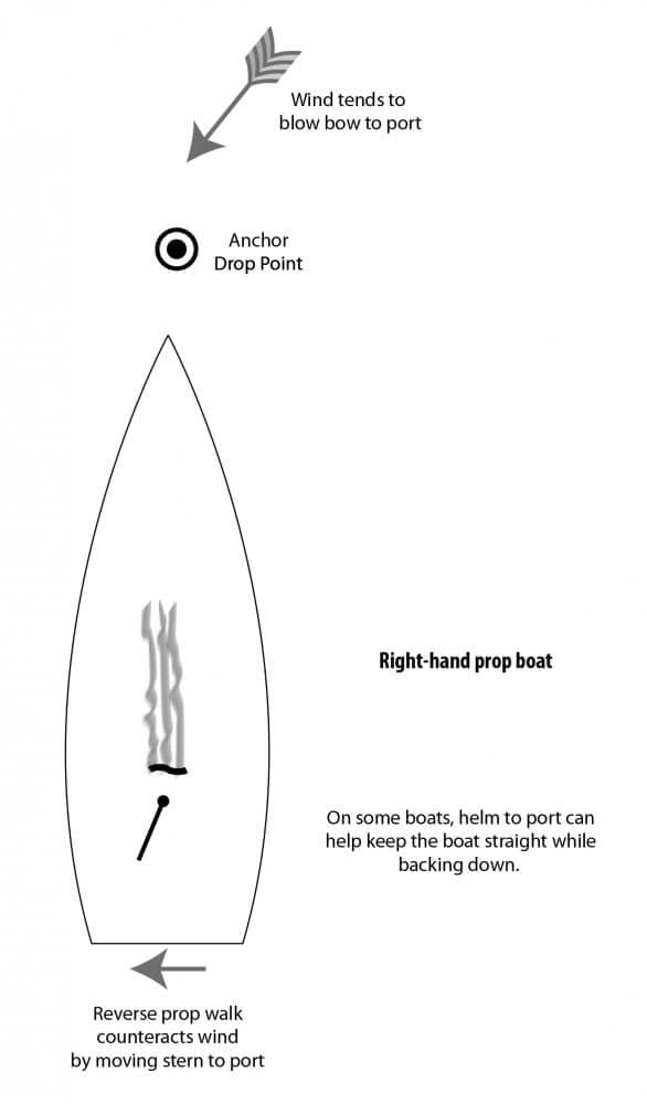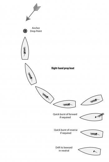 In anchoring, like docking, it’s vital to know which way our boat’s stern will kick in reverse. In our case it’s to port (right-hand prop) so we always approach the anchoring point with the wind about 20 degrees on the starboard bow.